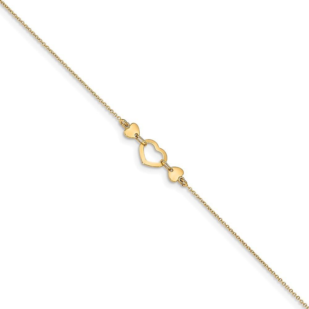 14k Solid Yellow Gold Polished Love Heart With .75inch Ext. Anklet 10 Inch-Anklet for Women
