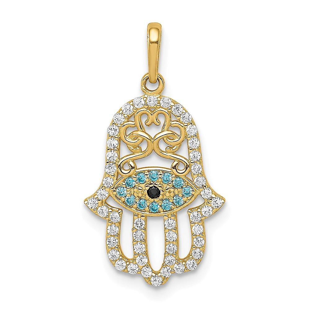 14k Multi-colored Cubic Zirconia Hamsa Pendant - Measures 22mm long - in 14k Yellow Gold - - Length of Item: 22 mm - Finish: Polished - Feature: Solid - - This Item Does Not Ship With a Chain - [ Potential Enhancement Methods: cubic zirconia ] - Synthetic. Some are covered with a product that makes the stone more durable. - [ Care and Handling: cubic zirconia ] - Clean with warm soapy water and a soft cloth. -