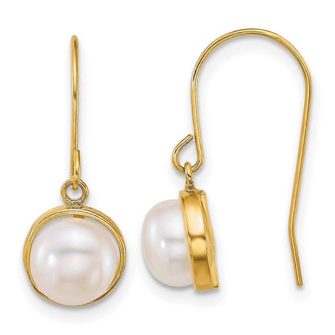 14k 6-7mm Button White Freshwater Cultured Pearl Dangle Earrings - Measures 21x8.12mm Wide - 1.6 Grams In 14k Yellow Gold - - Width of Item: 8.12 mm - Length of Item: 21 mm - Earring Closure: French Wire - Earring Type: Drop & Dangle - Finish: Polished - - [ Potential Enhancement Methods: Cultured Pearl ] - Usually bleached and polished to achieve uniform color and shape. May be dyed or irradiated to produce various colors. - [ Care and Handling: Cultured Pearl ] - Do not use ultrasonic cleaner or steamer. Avoid contact with cosmetics, hair spray, perfume and household chemicals. Clean with a soft cloth. -
