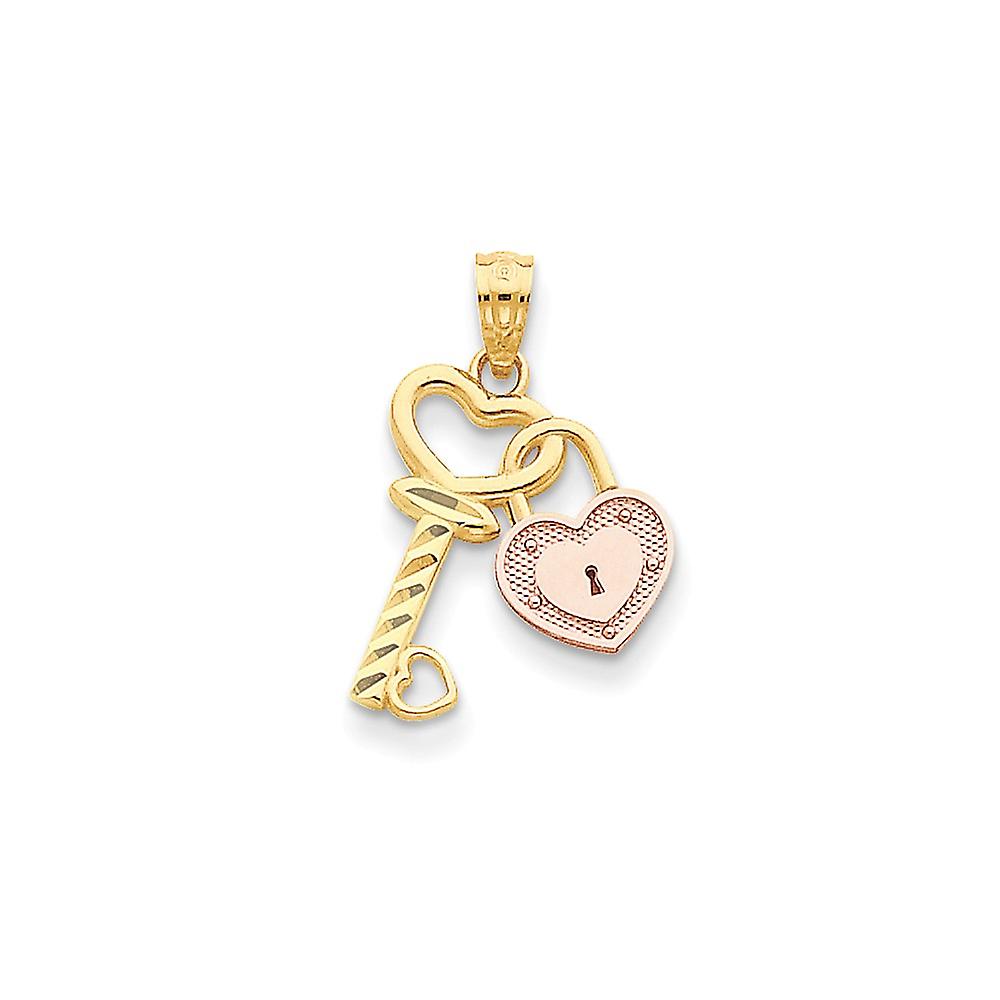 14k Two Tone Textured Polished Gold Love Heart Lock and Key Pendant Necklace 21x15mm Wide-Pendant for Women
