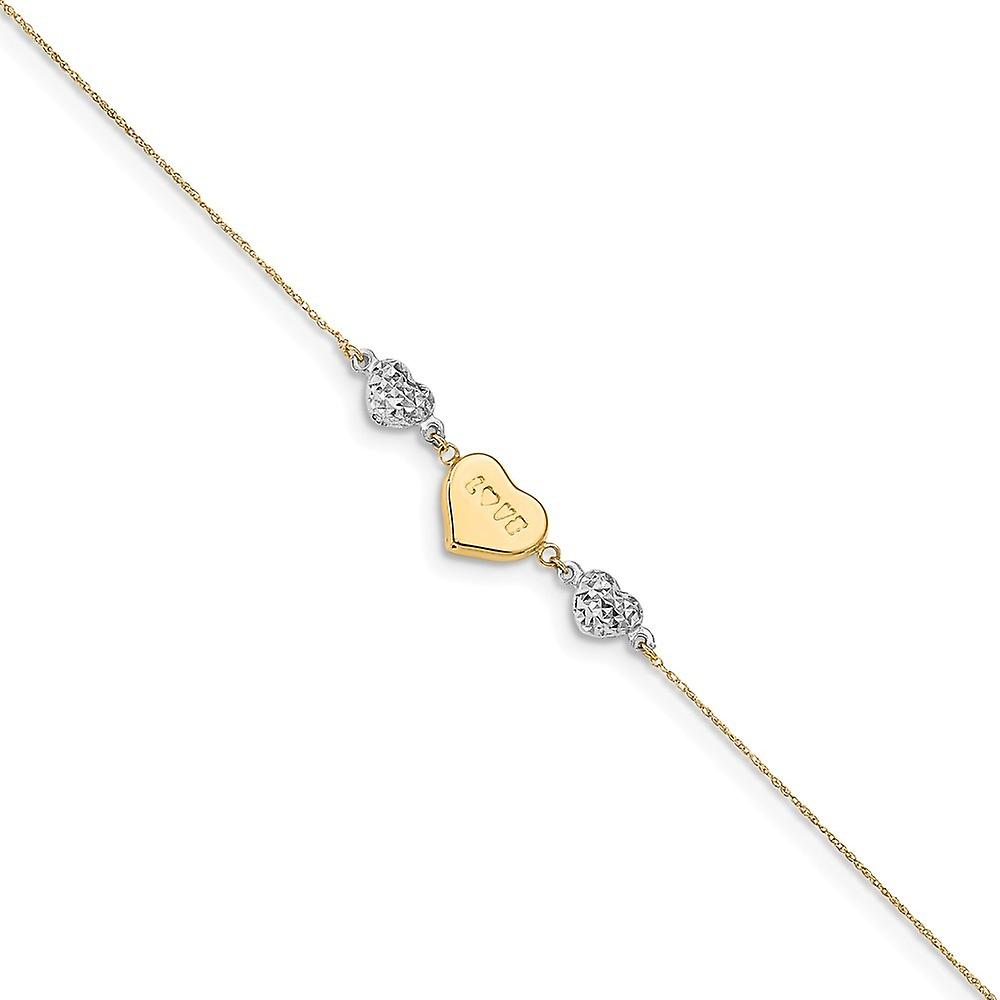 14k Two Tone Hollow Polished Spring-Ring Gold Puffed Love Heart and Sparkle Cut Hearts Bracelet 7 Inch 1mm Wide Link-Bra