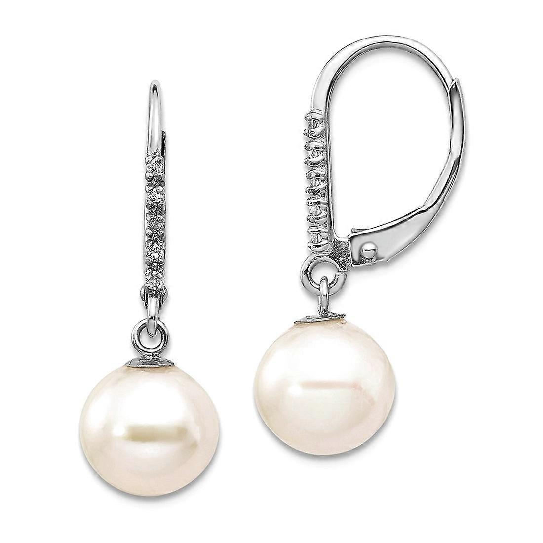 14k White Gold Diamond 8 9mm White Freshwater Cultured Rd Pearl Leverback Earrings 26mm long Stud Earring for Women