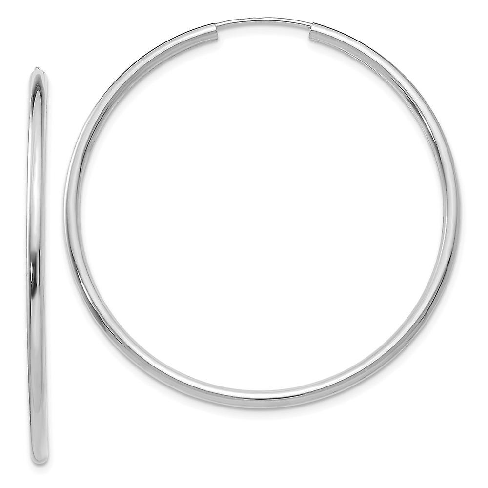 14k White Gold 2mm Polished Endless Hoop Earrings - Measures 41x41mm Wide 2mm Thick - 2.2 Grams in 14k White Gold - Product Attributes: - Hollow tube - - Thickness: 2 mm - Width of Item: 2 mm - Length of Item: 45 mm - Earring Closure: Hidden Wire & Catch - Earring Type: Hoop - Finish: Polished - Engravable: Not Recommended -