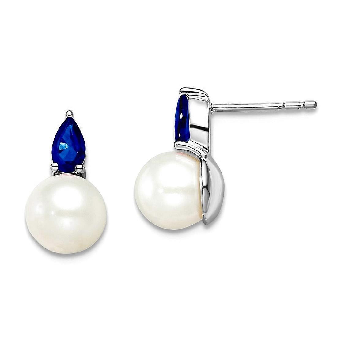 14k White Gold Freshwater Cultured Pearl and Sapphire Post Earrings 12.35x7mm Wide Stud Earring for Women