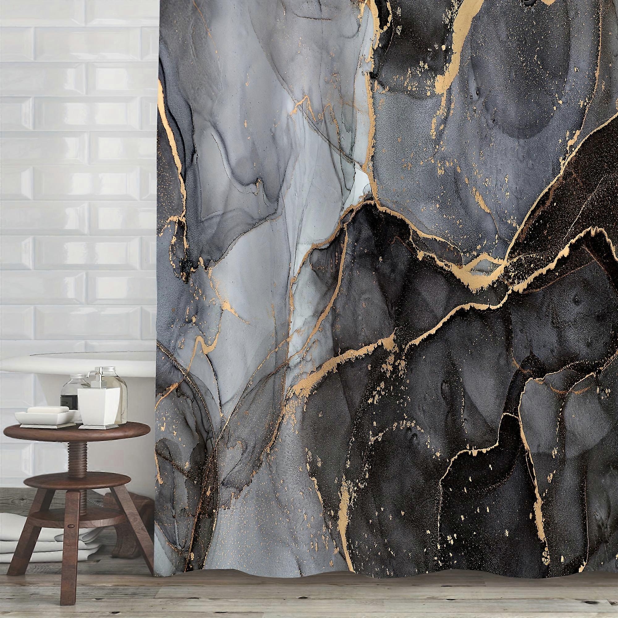 1/4pcs Luxurious Marble Pattern Shower Curtain Set - Waterproof, Golden Textured, U-Shaped Mat, Toilet Cover Mat, L-Shaped Mat, and 12 Hooks - Aesthet