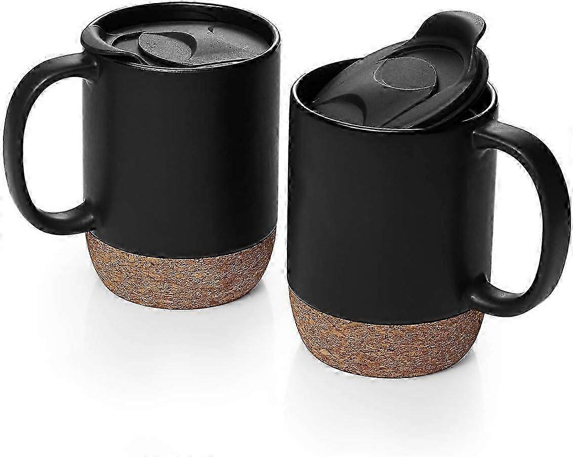 15 oz Coffee Mugs, Set of 2 Large Ceramic Mugs, Mug Set with Insulated Cork Bottom and Splash Proof Lid for Men, Women, Coffee, Tea, black