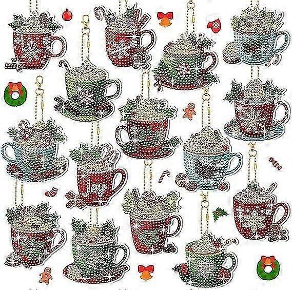 15 Pieces Christmas Hot Cocoa Colorful Diamond Painting Keychain Ornaments 5D DIY Kids Hot Cocoa Art Christmas DIY Crafts Home Decor