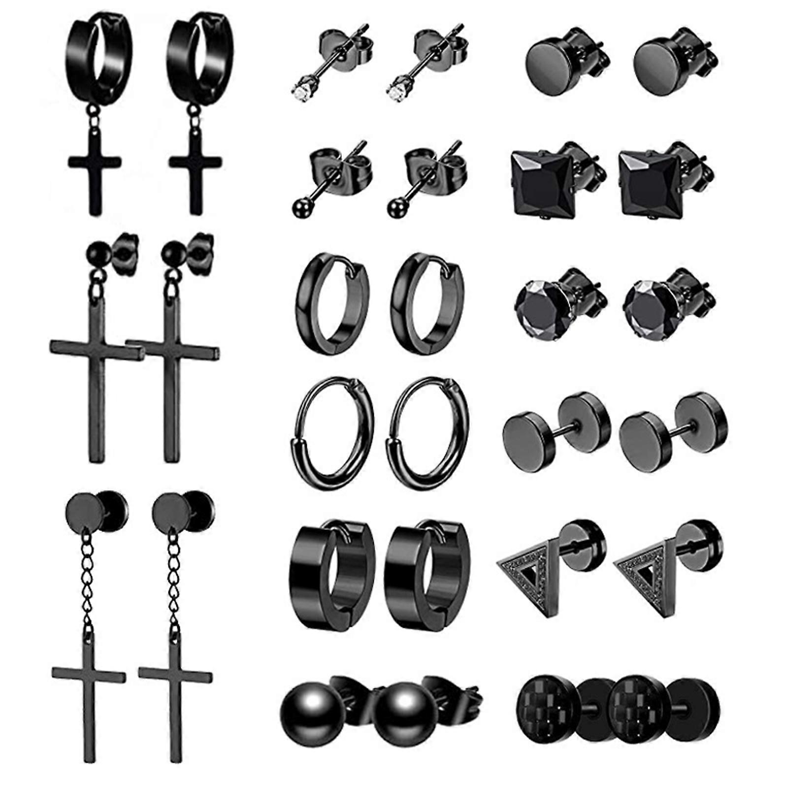 15 Pairs Black Stud Earrings Mens Earrings Hoop Stainless Steel Earrings Set