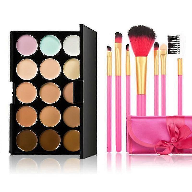 15 Colors Face Cream Makeup Concealer With 7pcs Pink Brushes