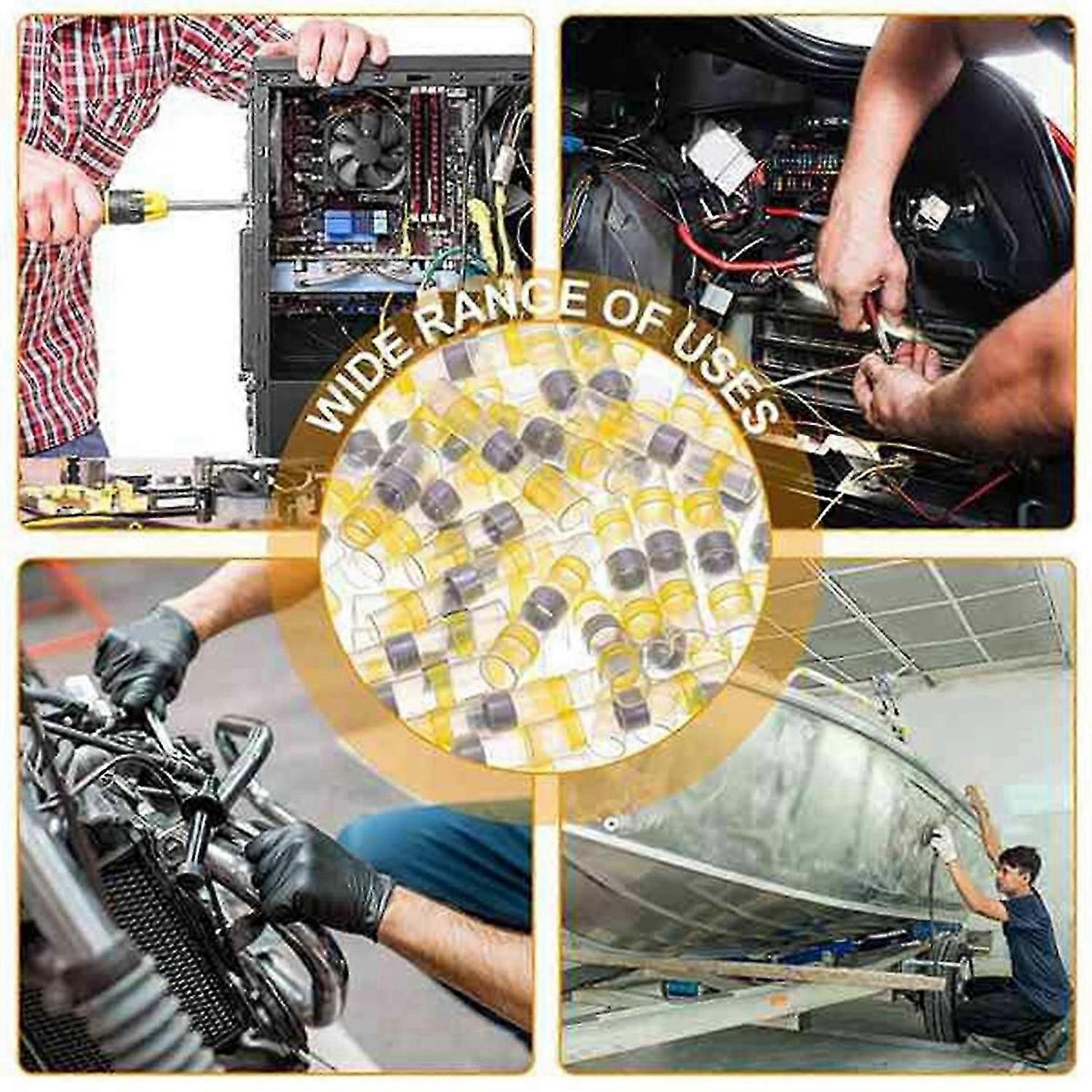 What get: the package comes with 150 pieces of 12-10 AWG yellow heat shrink butt connectors with heat shrinkable, waterproof and conductive properties, which are sufficient to meet your needs Insulated and waterproof: the electrical wire terminal comes with outer polyolefin tube and inner hot-melt ring, which can effectively improve waterproof performance, so it is very suitable for the automotive and marine industries Easy to use: you can just put 2 stripped wires into the solder sleeve and heat it with a hot air , and the insulating tube shrink with a shrinkage ratio of 2:1 to form a waterproof seal, so as to complete the connection Practical design: these solder seal wire connectors are different from ordinary heat-shrinkable tubes, designed with solder ring and do not need crimping; The solder seal terminals are transparent and can be accurately inspected when the wires are stripped and inserted inside Scope of usage: the insulated butt splices are useful tools to provide protection for wires, which are often applied in automobile, ship, marine, motorcycle and vehicles, and also applied for scientific wiring projects<br><br>Colour:yellow Material:Polyolefins<br><br>Package Contents: 150 x Solder seal heat shrink butt wire connectors<br><br>Only the above package content, other products are not included. Note: Light reflection and different displays may cause the color of the item in the picture a little different from the real thing. The measurement allowed error is +/- 1-3cm.