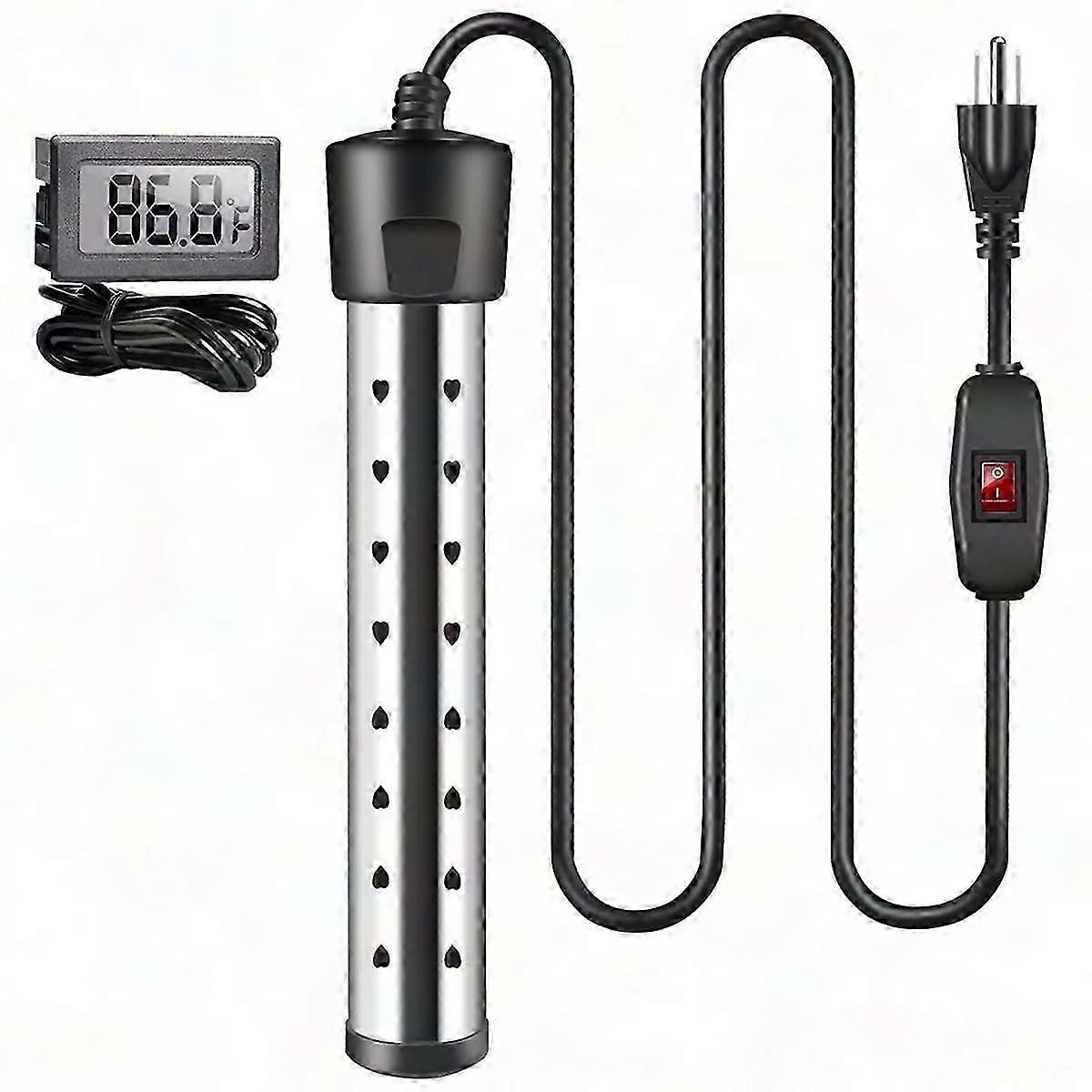 Upgraded Durability: Transitioning from 201 to 304 stainless steel, our immersion heater now offers superior resistance. The robust 3-ground UL plug enhances and , ensuring a dependable heating solution for extended use. Sealed Waterproof Design: Featuring a meticulously sealed construction, our heater enhances both aesthetics and . The seamless design prevents water ingress, ensuring safe operation. Always use the included thermometer to monitor temperature without direct contact. User-Friendly Operation: Simply submerge the heater, connect and switch on. Use the digital LCD thermometer to safely check water temperature. Remember to turn off and unplug before removing the heater from water, ensuring no direct contact with hot surfaces. Versatile and Portable: Ideal for heating water in bathtubs, inflatable pools, and buckets, this powerful 1500W heater is also perfect for outdoor activities like camping. Its portability ensures you can enjoy warm water wherever you go without long waits. Plug Type: US Plug, it applies to Canada, India, Mexico, Thailand, Taiwan, the , the Philippines and so on. Voltage: AC110V Colour:Black Material:Stainless steel Package Contents: 1x water heater 1x thermometer Only the above package content, other products are not included. Note: Light reflection and different displays may cause the color of the item in the picture a little different from the real thing. The measurement allowed error is +/- 1-3cm.