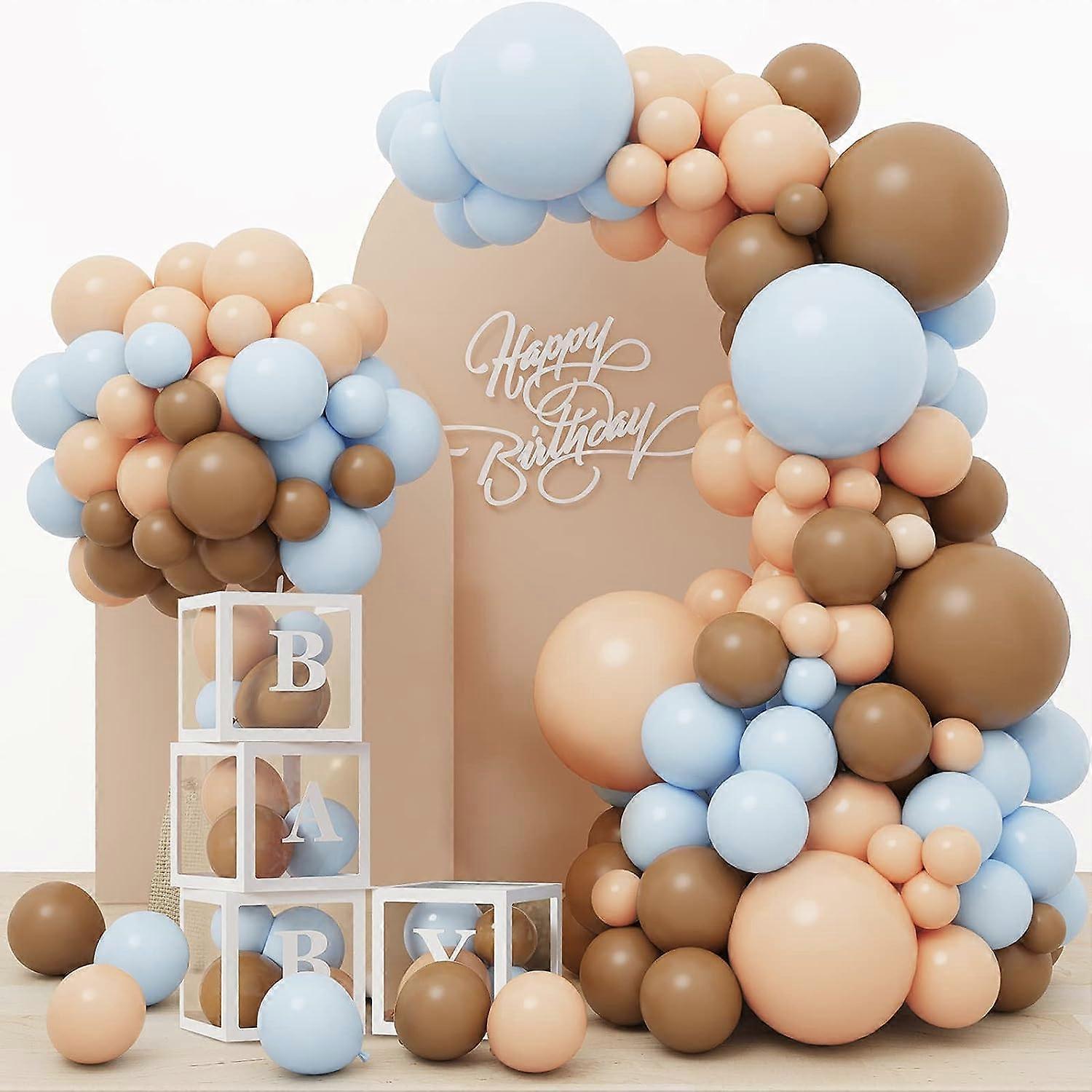 156pcs Brown Blue Balloon Garland Arch Kit and Baby Shower White Clear Block Boxs with Letters for Baby Shower Birthday Party Decorations