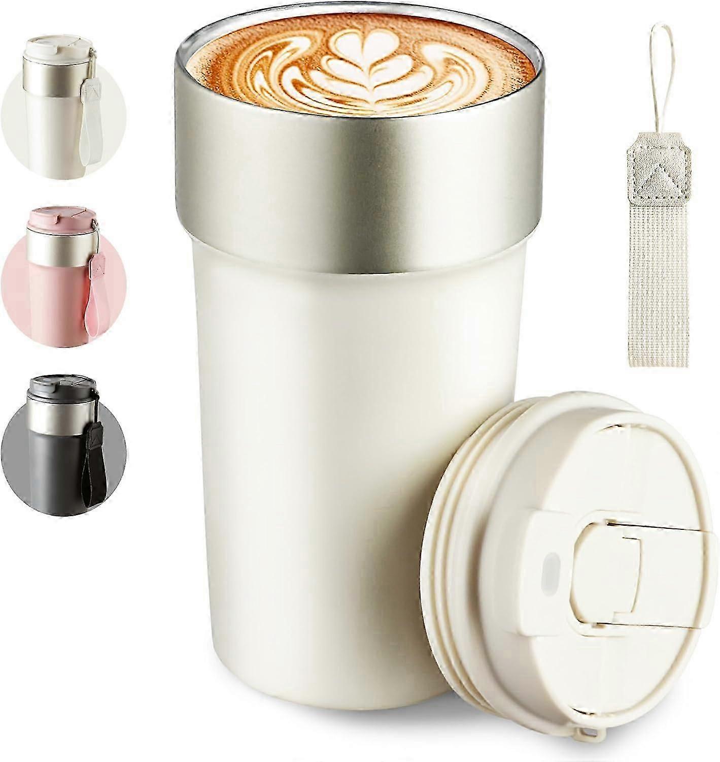 16 oz Travel Coffee Mug Tumbler with Lid and Straw, Insulated Leak Proof with Flip lid, Stainless Steel Vacuum Cup, Cream White