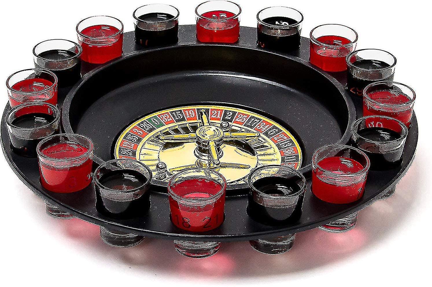 The Drinking Roulette Game contains a roulette wheel, two roulette balls and 16 numbered shot glasses.