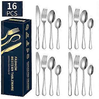 PREMIUM 16PIECE SILVERWARE SET FOR 4: This flatware set contains 4 dinner forks, 4 dinner spoons, 4 dessert spoons, 4 dinner knives. Its the ideal set for home daily use, and also for restaurants, pubs, cafes, and hotels. This cutlery set also help your dinner full of design while having a party.