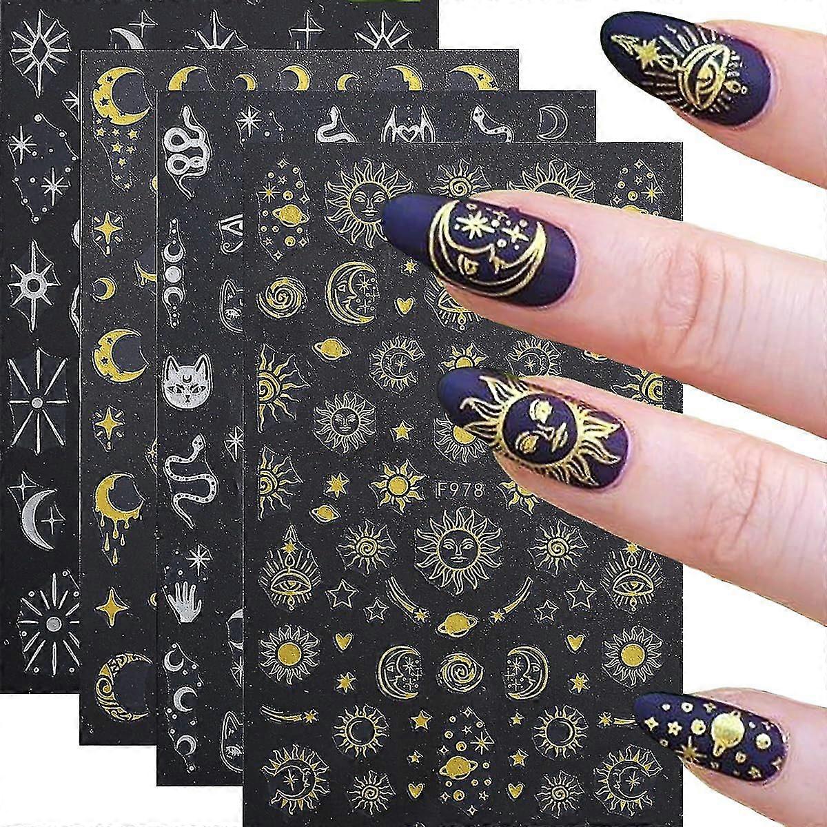 16 Sheets Sun Moon Star Nail Art Stickers 3D Holographic Self-Adhesive Decals Gold Silver Metallic Effect Gothic Celestial Sliders Sticker for Nails S
