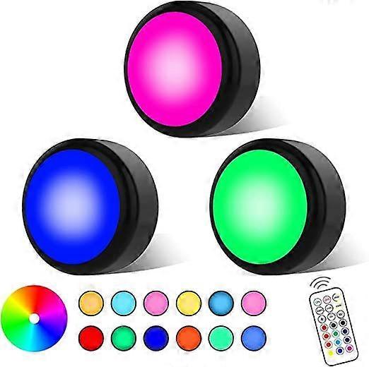 Product DescriptionRemote control and manual control - LED cabinet lights are equipped with a remote control, which can set the switch/brightness/color and lighting mode. Press the lampshade to turn the light on/off. You can also switch the color of the light by short pressing on the lampshade, or adjust the brightness by long pressing on the lampshade.4 preset lights and 12 color lights -4 preset lights: warm white, red, green, blue, can display 16 colors together, bringing you a pleasant, interesting, and romantic atmosphere.Easy to install and disassemble - wireless design, easy to stick. Each LED closet light is powered by 3 AA batteries (excluding batteries, it is recommended to use rechargeable batteries) and quickly installed using original tape. Suitable for your corridors, kitchens, closets, bedrooms, cabinets, bookcases, food storage rooms, stairs, steps, miscellaneous rooms, basements, etc. It can also serve as a colored ambient light.Adjustable brightness - up to 80 lumens. Both the remote control and the+/- buttons on the lamp housing can be used for stepless dimming. A remote control can control all 6 lights.Specifications:Voltage: 4.5 volts;Power: 0.6WShell material: ABSLamp: 3 AA batteries (not included)Remote control: CR2025 battery (included)Control method: manual+remote controlRemote control effective distance 3-5 metersThree Lights One Shake Kraft Paper Box Weight: 185gBox size: 132 * 102 * 80mnLamp size: 77 * 77 * 31mmPackage includes: light * 3, double-sided adhesive * 3, remote control * 1, English instruction manual * 1Modern home - full of modern atmosphere - upgraded disc lights will fundamentally change your feeling of the kitchen, life, and bedroom closet. 13 color schemes (warm white and 12 RGB color variations) and a perfect home lighting experience.Two flexible control methods - use a wireless remote control or press the lampshade to easily control the ice hockey lights. 6 LED ice hockey lights with 2 remote controls. Remote control on/off and all RGB lights, with a radius of up to 20 feet. Even in difficult to reach areas, it is easy to control battery powered lights. Manually pressing the black lampshade can open/close and change the color to warm white, green, red, and blue.Closer to life features and colors - Starting from the last light you turned off, setting an automatic turn off timer, adjusting brightness to any level, setting 13 colors and 2 dynamic modes (fade/smooth) are enough for you to enjoy a better life. You can also set a timer to automatically turn off after 30 or 60 minutes. Every time the light is turned off, the timer will reset itself to the default value.Easy to install - Each wireless LED closet light is powered by 3 AA batteries of ice hockey lights (excluding batteries), quickly installed using original 3M tape (including 3 pieces), firmly attached, and will not scratch furniture. Simply unscrew the lamp from the base and insert a new battery to replace the battery.