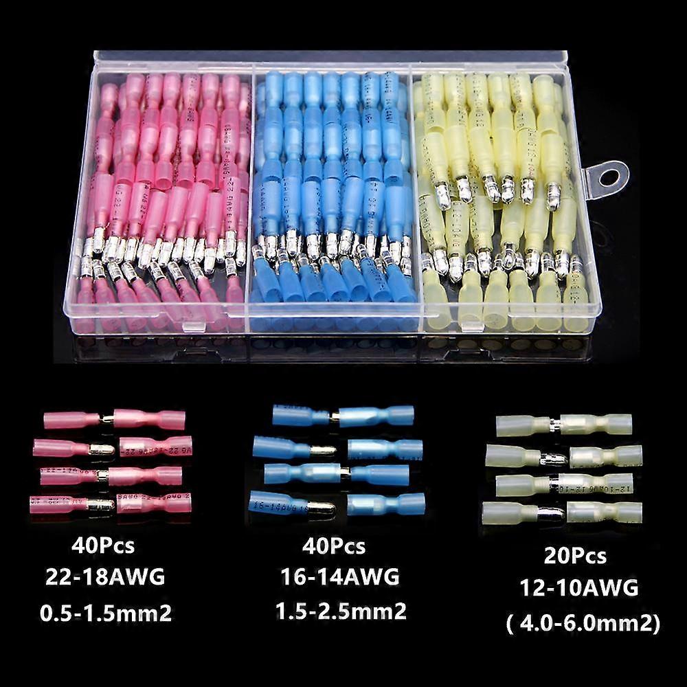 RM22718040540148678 Product Description 100Pcs Heat Shrink Wire Connector Kit Electrical Insulated Waterproof Crimp Marine Automotive Terminals Package Included: 100pcs x Heat Shrink Wire Connectors with a transparent bag Size: 20Pcs Yellow Connectors: Suits cable / wire sizes 12-10AWG / 4.0-6.0mm2 (20 male, 20 female) 40Pcs Blue Connectors: Suits cable / wire sizes 16-14AWG / 1.5-2.5mm2 (30 male, 30 female) 40Pcs Red Connectors: Suits cable / wire sizes 22-18AWG / 0.5-1.5mm2 (30 male, 30 female) Specifications: Qty: 100pcs Color: Yellow,Red, Blue Material: Made with heat shrink tubing. Type:Yellow Connector: HS-MDD5.5-156 + HS-FRD5.5-156 Blue Connector: HS-MPD2-156 + HS-FRD2-156 Red Connector: HS-MDD-1.25-156 + HS-FRD-1.25-156 Features : -Quick to connect, quite easy to use,can be ideal use in marine and automobile applications -When properly heated and shrunk,
