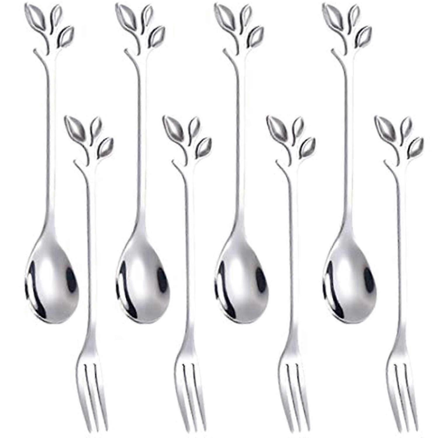 [Dishwasher Safe] -- Premium Stainless Steel. It Is Easy To Clean For Both Hand Washing And Dishwasher Cleaning. [Size] -- fork 4.7 inch,Spoon 4.7 inch.Perfect For Tea, Coffee, appetizers, desserts, mini cake, charcuterie, Stirring etc. Also worked great as small fruit salad, tasting forks . [Craft] -- Mirror Polishing Process With Bright And Surface, Edge Is And Without Burrs,Not Rough And Will Never Cut Your Hands And Mouth. [ Design] -- Fork & Spoon Features Stylish Leaf Shapes. This Is The Best Gift For Friends And Families. Perfect For Events, Parties, Birthday and Wedding . Also Perfect For Daily Use. Colour: Silver Material: stainless steel Package Contents: 8 x spoons 8 x forks Only the above package content, other products are not included. Note: Light and different displays may cause the color of the item in the picture a little different from the real thing. The measurement allowed error is +/- 1-3cm.