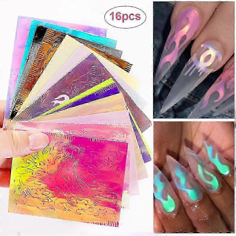 16pcs Holographic Fire Flame Nail Stickers Flames On Manicure Stencil Art Decoration