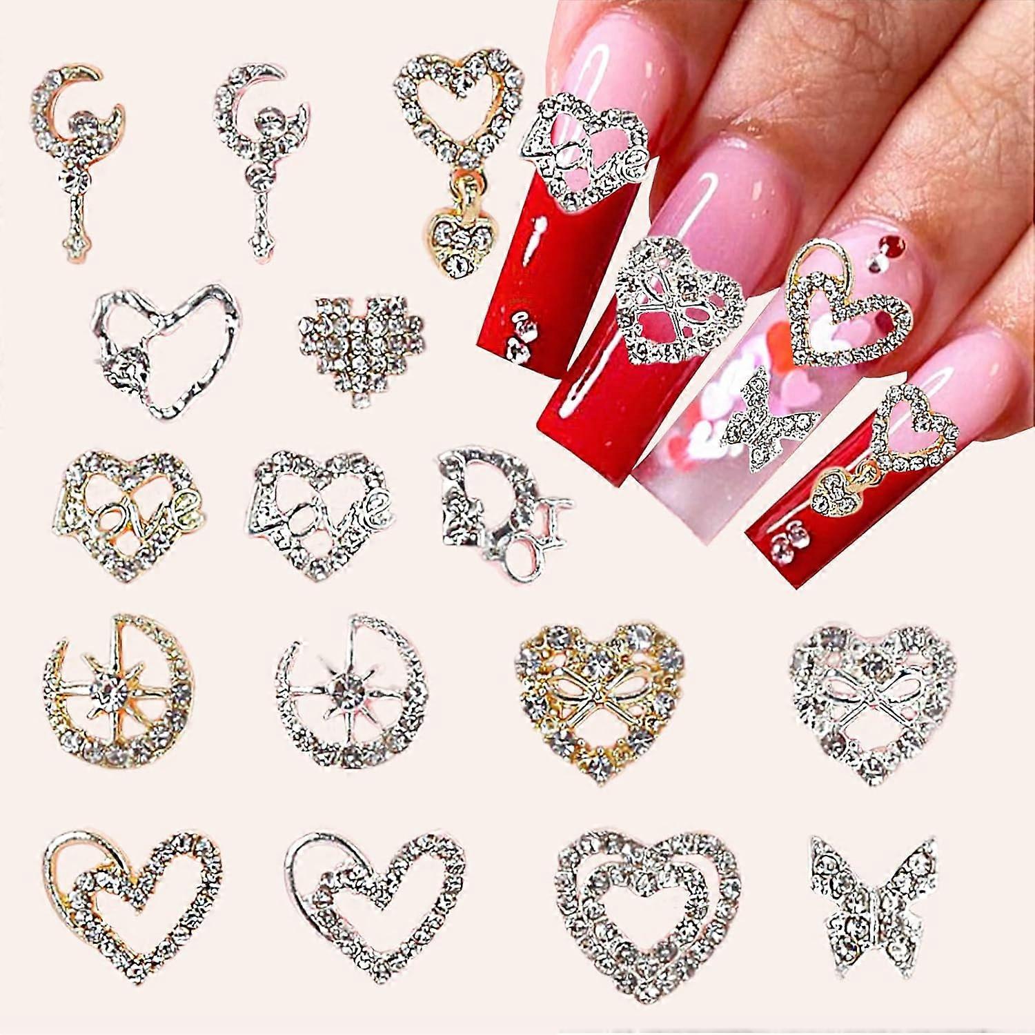 16pcs Love Heart Nail Charms 3D Silver Gold Nail Stones