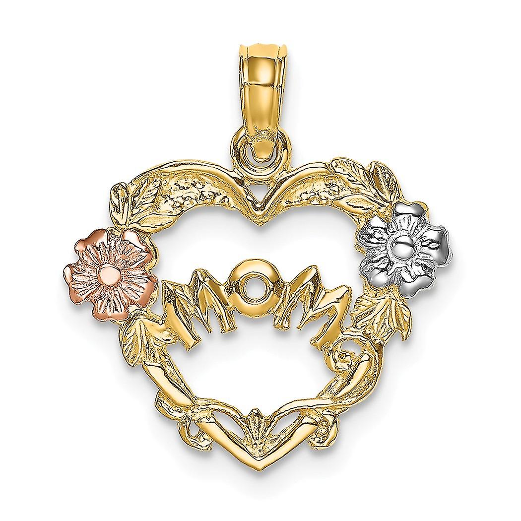 17mm 14k Tri color Gold Mom Banner In Love Heart Pendant Necklace W Wht and Ylw Flowers-Tri-color-Pendant for Women
