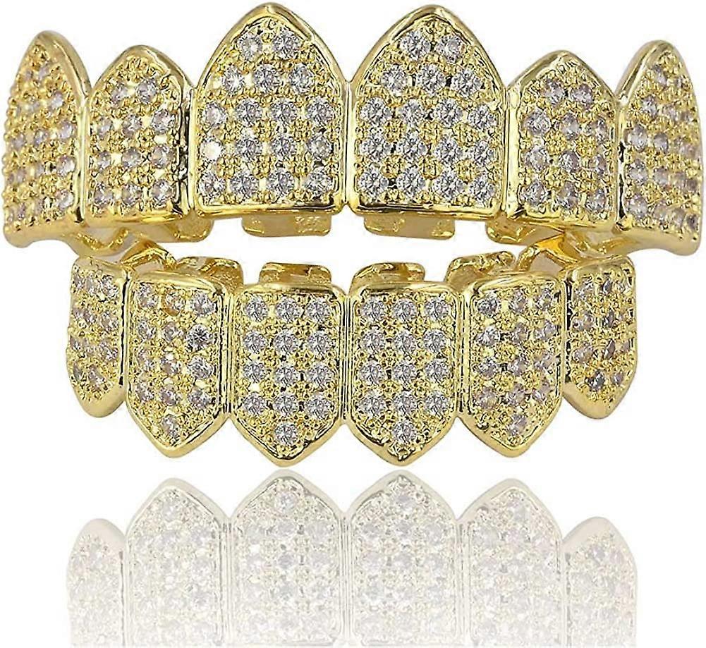 18 Karat Gilded Simulated Diamond Top Bottom Teeth Grill Set For Men Women