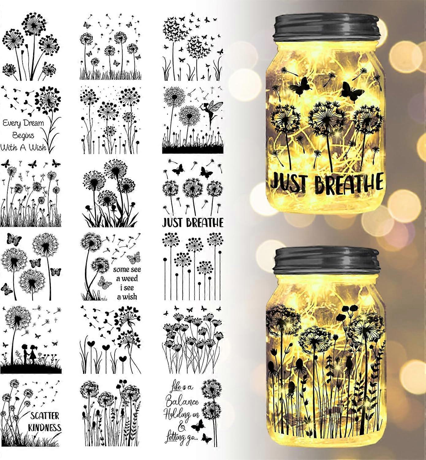 18Pcs Dandelion Transfer Stickers 3.9x3.6inch Flowers and Plants Decals Stickers Dandelion Butterfly Rub on Transfer for Mason Jars Furniture Vase Gla
