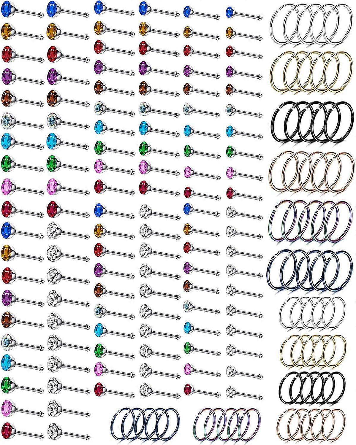 180Pcs 20G Surgical Stainless Steel Nose Rings Hoops Straight/L Shapes Nose Studs 2.0/2.5/