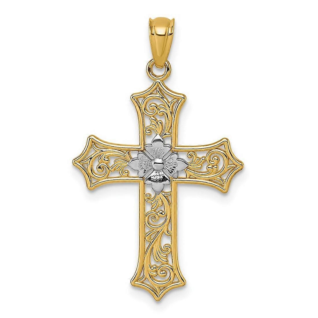 19.1mm 14k and Rhodium Polished Floral Religious Faith Cross Pendant Necklace-Pendant for Women