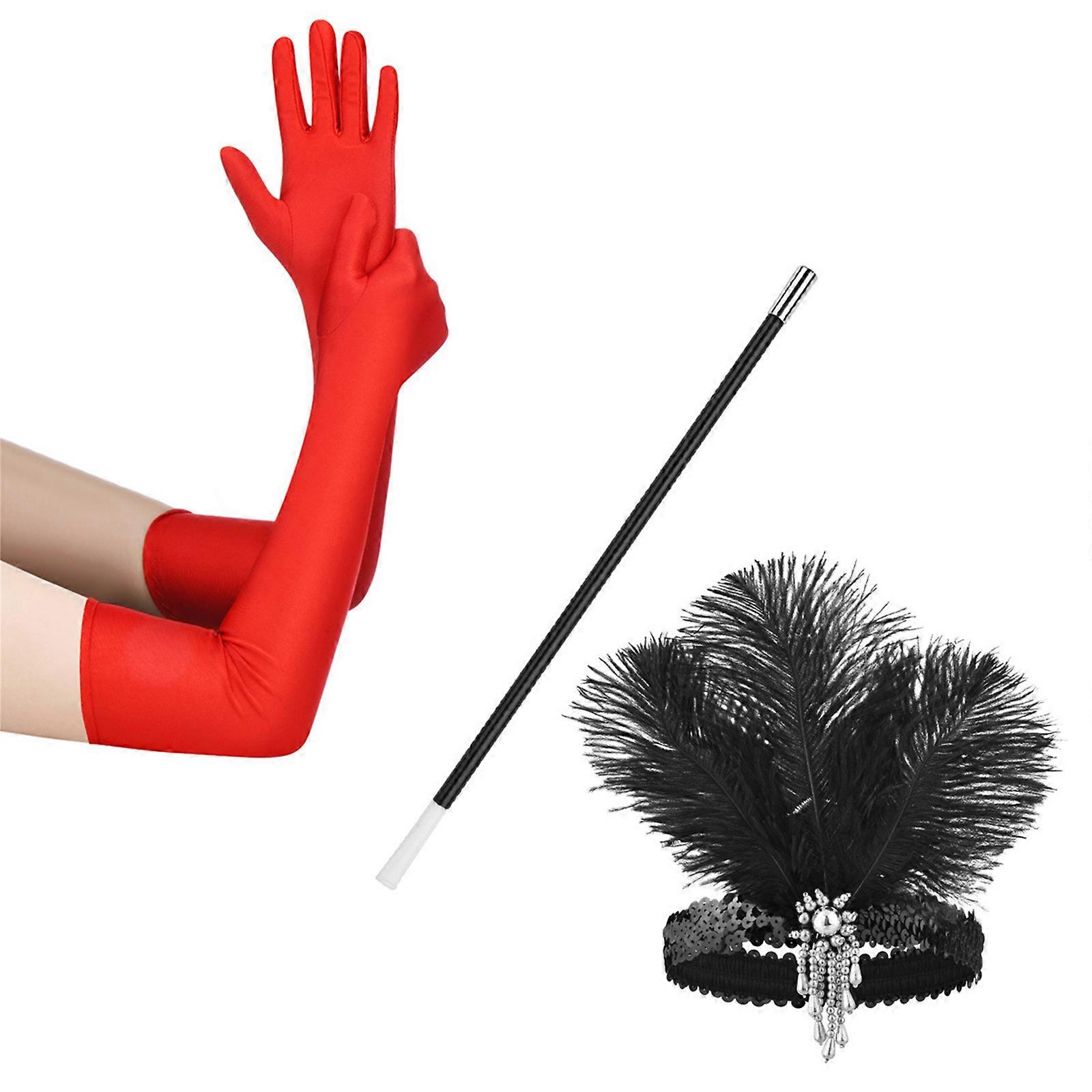 1920s Flapper Party Costume Accessories for Women Vintage Rhinestones Headpiece Long Gloves Masquerade Party Wear Red