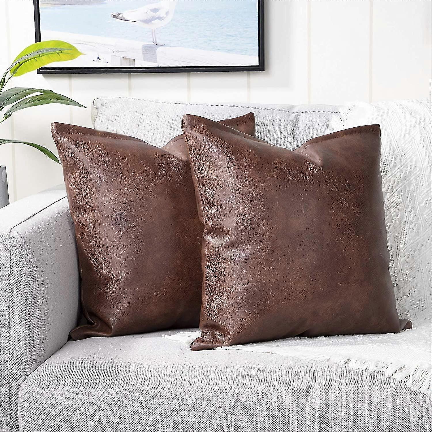 Set Of 2 Faux Leather Decorative Throw Pillow Covers Modern Solid Outdoor Cushion Cases Luxury Pillowcases For Couch Sofa Bed 18x18 Inches Dark Brown