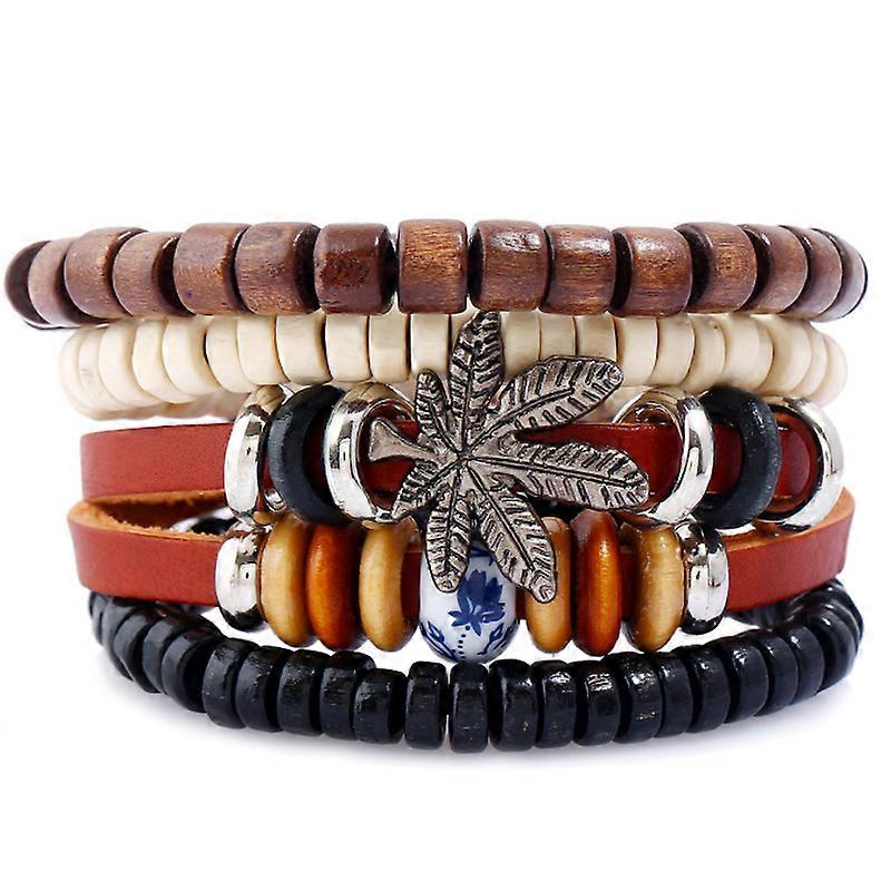 2set Vintage Wood Beaded Cowhide Bracelet Handmade Maple Leaf Bracelet Jewelry Gift