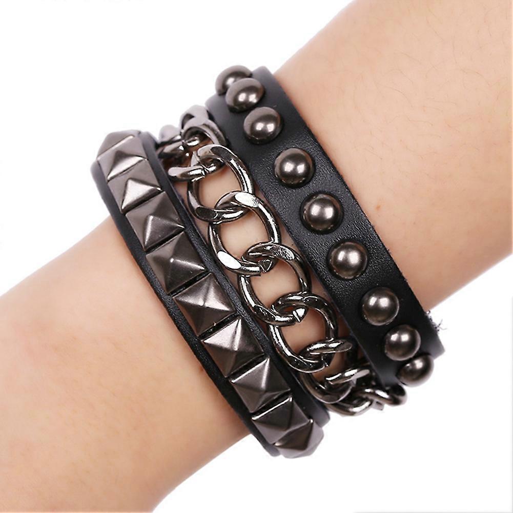 2set Punk Rock Unisex Muti Layers Cone Circle Rivets Bracelet Chain Leather Bangle Hand Jewelry