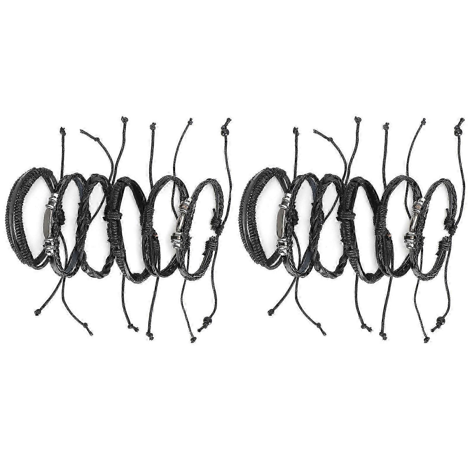 2Sets Adjustable Braided Bracelet Metal Inlaid Wristband Retro Style Cuff Artificial Leather