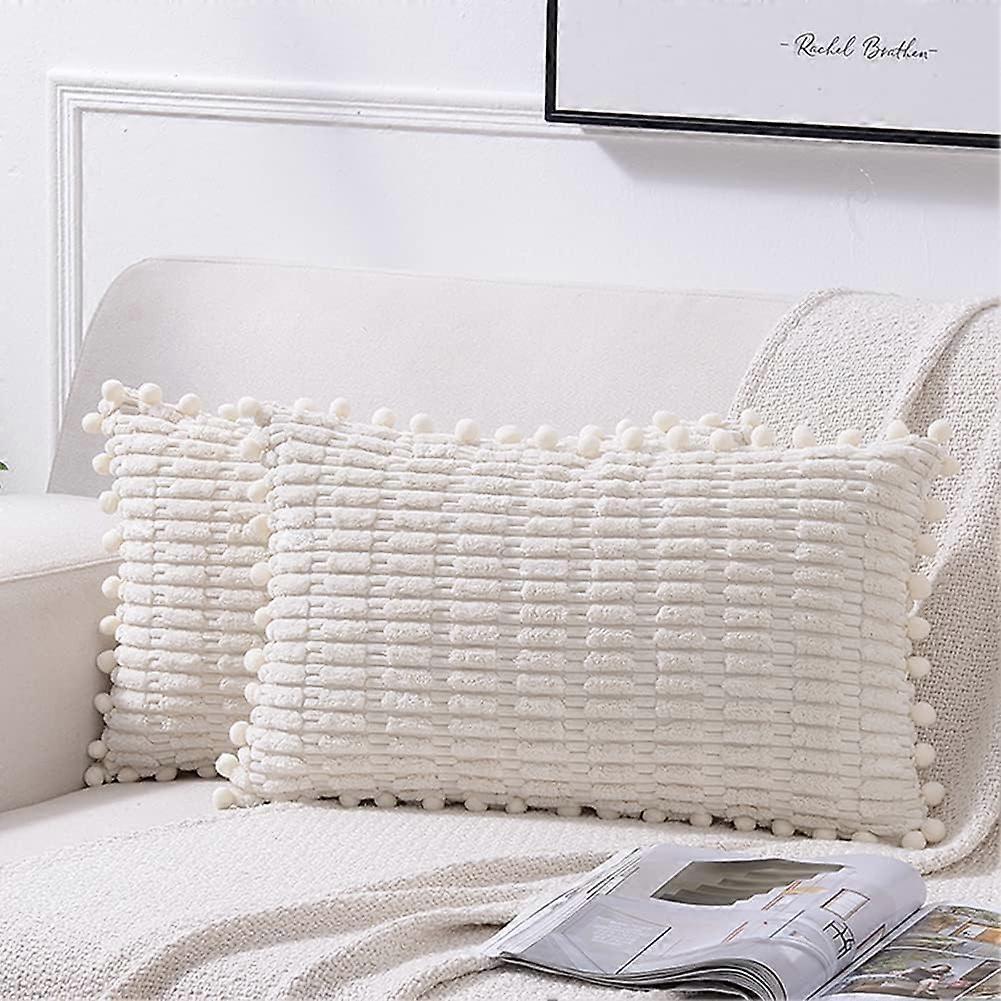 2 Packs Cream Lumbar Decorative Throw Pillow Covers 12x20 Inch with Pom-poms for Couch Bed Living Room, Farmhouse Boho Home Decor, Soft Corduroy Cute