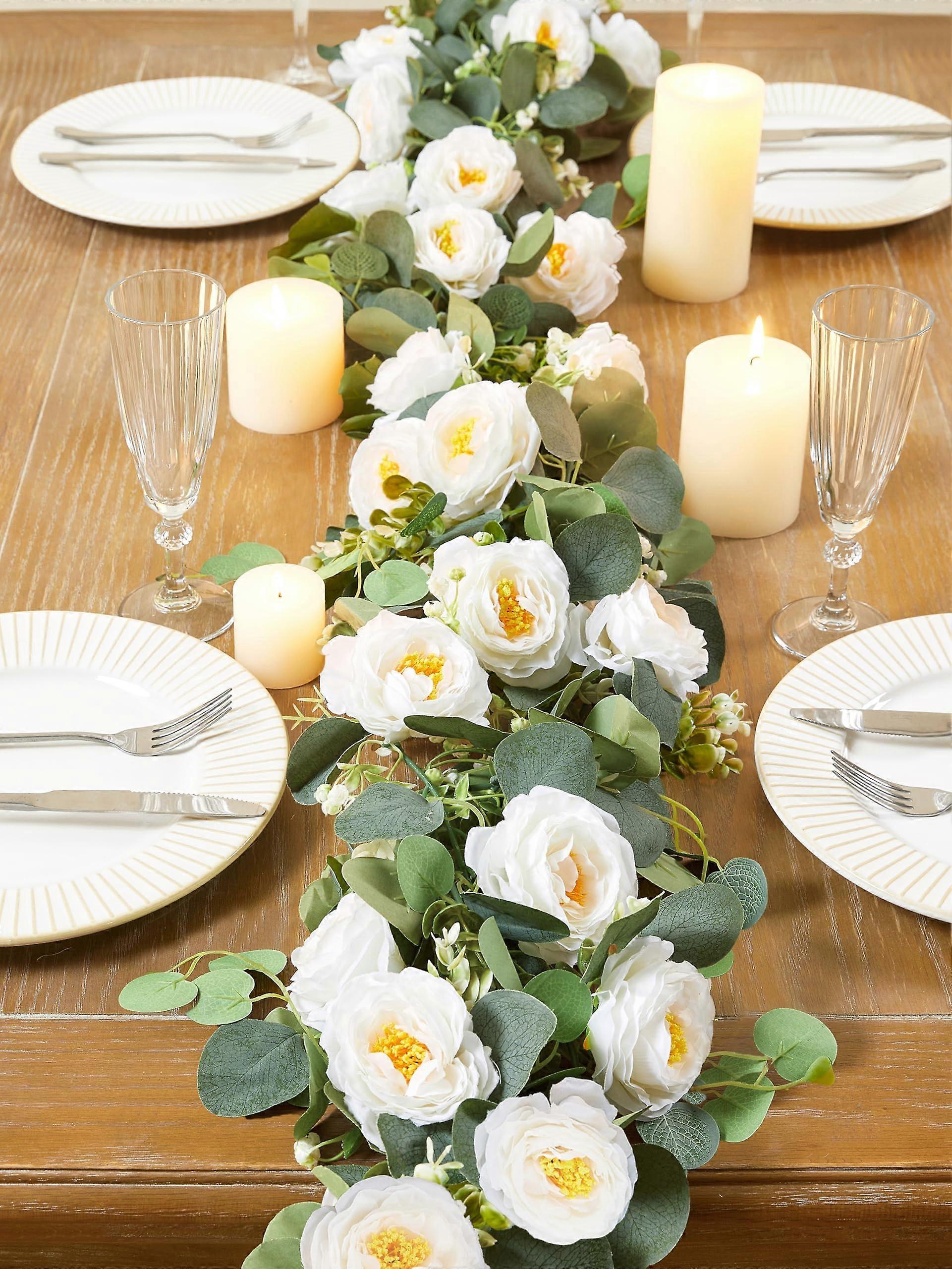 2 Pack Artificial Eucalyptus Garland with White Roses for Wedding Party 5.91Ft