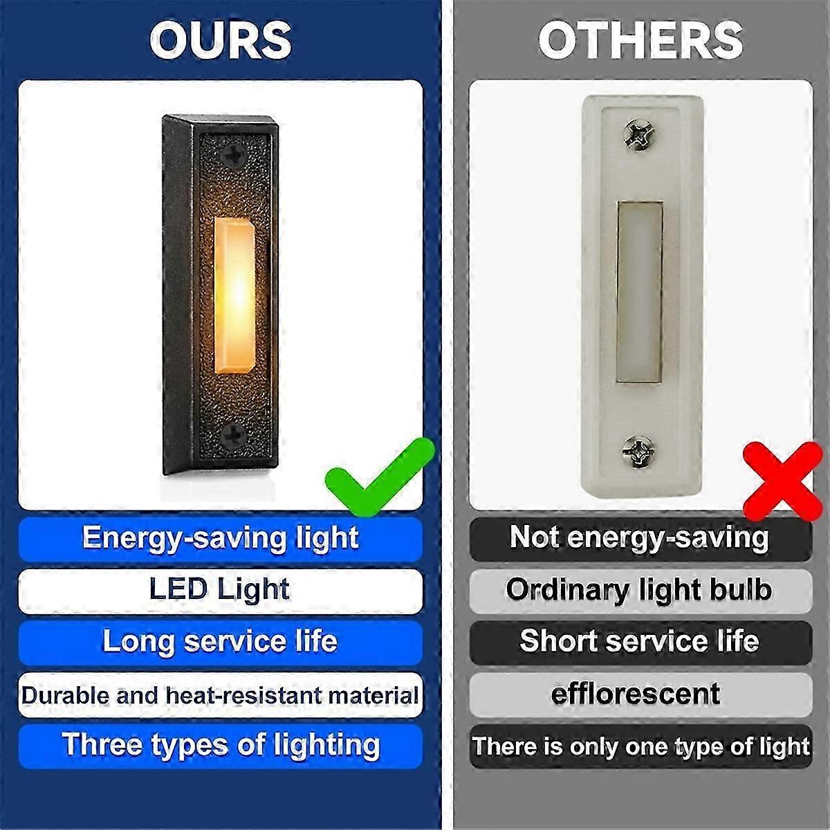 [LED Lighted Doorbell Button]Wall-mounted doorbell button has a built-in LED light, Lighted wired doorbell can be applied to cement or wooden surfaces. It provides excellent visibility after dark, giving you convenience at night and helping your visitors find your doorbell easily [Sturdy and ]This doorbell button is made of a sturdy doorbell cover, which is not easy to break and deform. The interior is made of high-quality material and can be used for many years without replacement, making it an ideal choice door bells for homes [Easy Installation]Easily replaceable wired doorbell button and garage door switch measure approximately 2.87 x 0.86 x 0.59 inches /7.3 x 2.2 x 1.5 cm (L x W x H) and come with 4 screws. easy to install (note: wires not included) [Wide Application]Universal wall-mounted door bell button works with most low-voltage chime systems. It can be used on your front door or garage door button, and is a good replacement for your old garage door opener or doorbell switch (The picture shows the lighting effect, the button is actually white) Color: Black Material: plastic Package Contents: 2 Pieces * Illuminated Doorbell Button 1 set * screw Only the above package content, other products are not included. Note: Light reflection and different displays may cause the color of the item in the picture a little different from the real thing. The measurement allowed error is +/- 1-3cm.