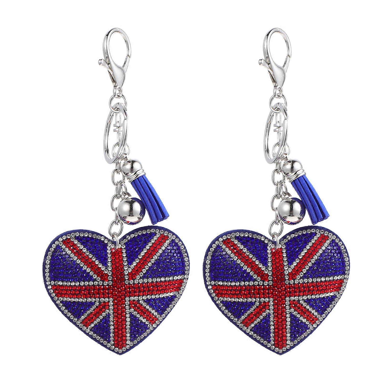 2Pcs Union Jack Keychain Heart-shaped Key Ring Rhinestone Alloy Keychain Women Bag Pendant