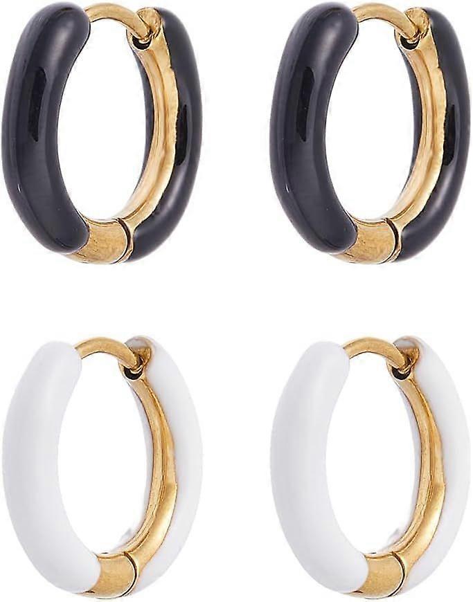 2 Pairs Small Enamel Hoop Earrings Black White Huggie Hoop Earrings 15-16mm Stainless Steel Huggie Hoop Earring Cute Statement Earrings Round Hoop Ear
