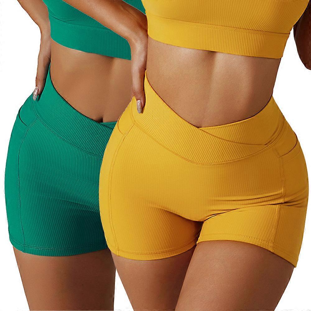 2 women's high-waisted tight-fitting running shorts, cross-waisted hip lifting yoga shorts, pocket cycling running fitness pants