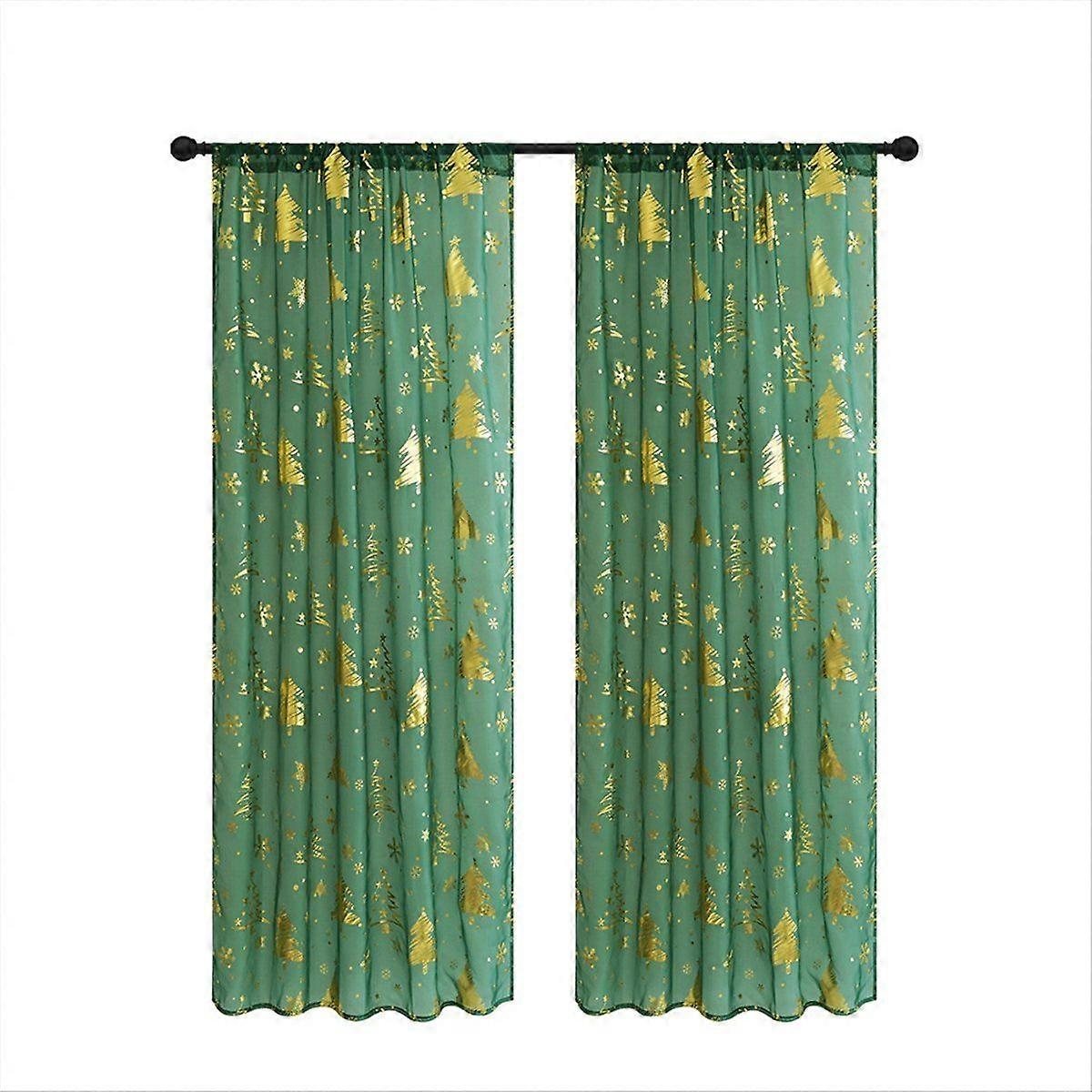 Snowflakes Design: The green Christmas sheer curtains feature elegant gold foil print snowflakes, enhancing your festive atmosphere. Premium Fabric: Made of high-quality sheer voile, these curtains offer excellent drape and durability, perfect for any room. Balance Privacy & Light: These curtains provide privacy while allowing sunlight to filter through, creating a cozy holiday ambiance. Size Information: Sold in pairs, each panel measures 52"W x 107.9"L, with 2.8" rod pocket for easy installation. Easy Care: Machine washable with mild detergent, these curtains are easy to maintain, ensuring long-lasting beauty. Color: Green Material: Polyester Package Contents: 2 * Window Curtains Only the above package content, other products are not included. Note: Light reflection and different displays may cause the color of the item in the picture a little different from the real thing. The measurement allowed error is +/- 1-3cm.