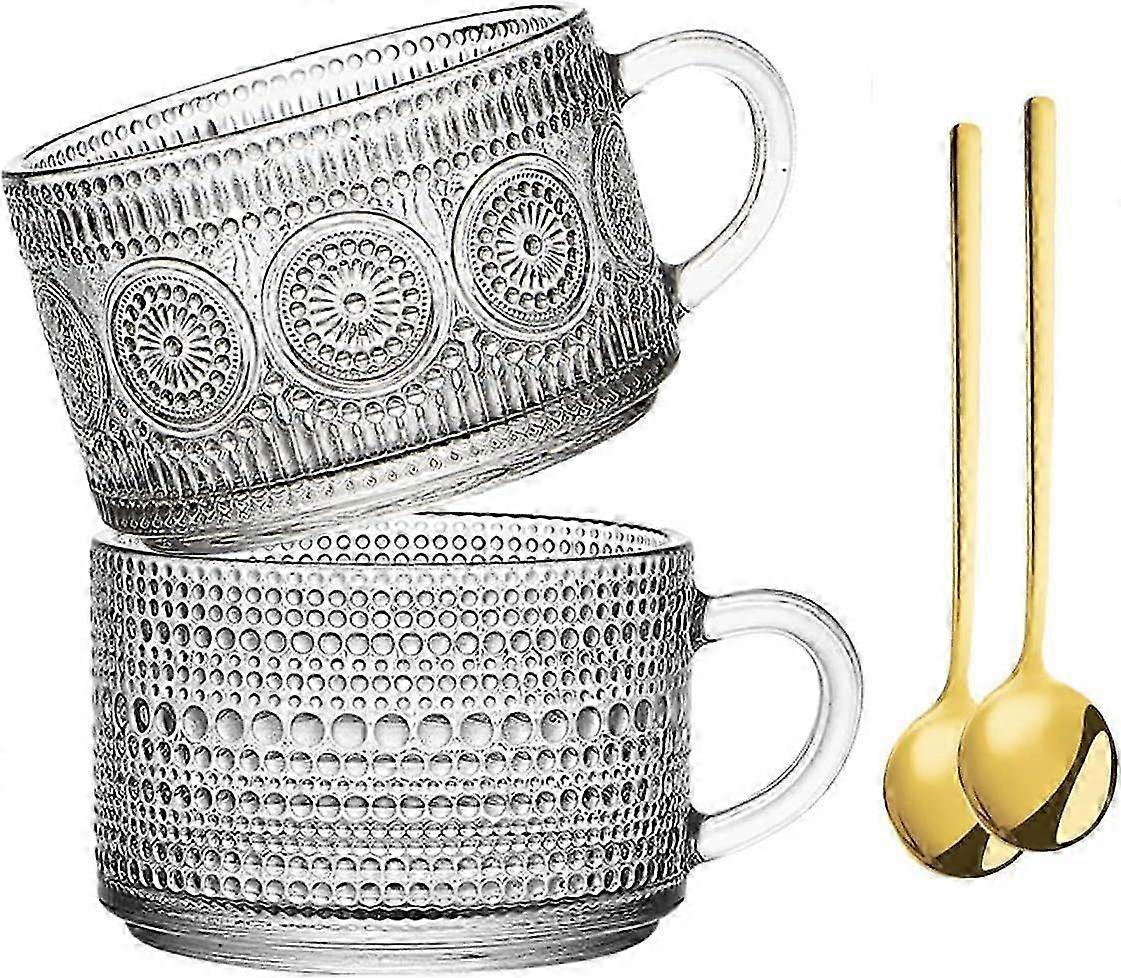 2Pcs Vintage Glass Coffee Mugs 400ml with Spoons, Clear Embossed Tea Cups