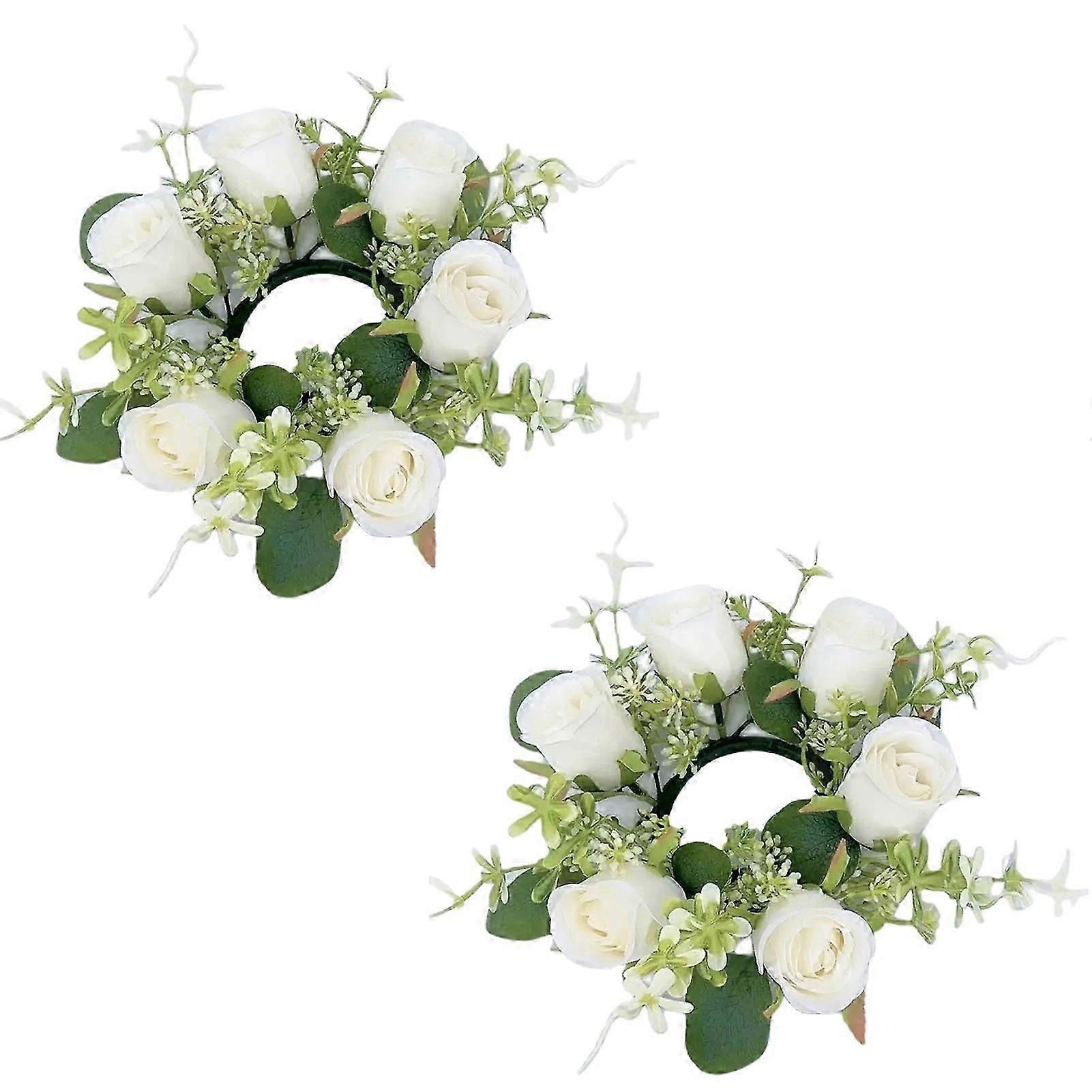 2Pcs Artificial Rose Wreath Candle Ring Pillar Candle Holder Green Leaves Colorful Flower Garland Home Wedding Party Table Centerpiece Decoration