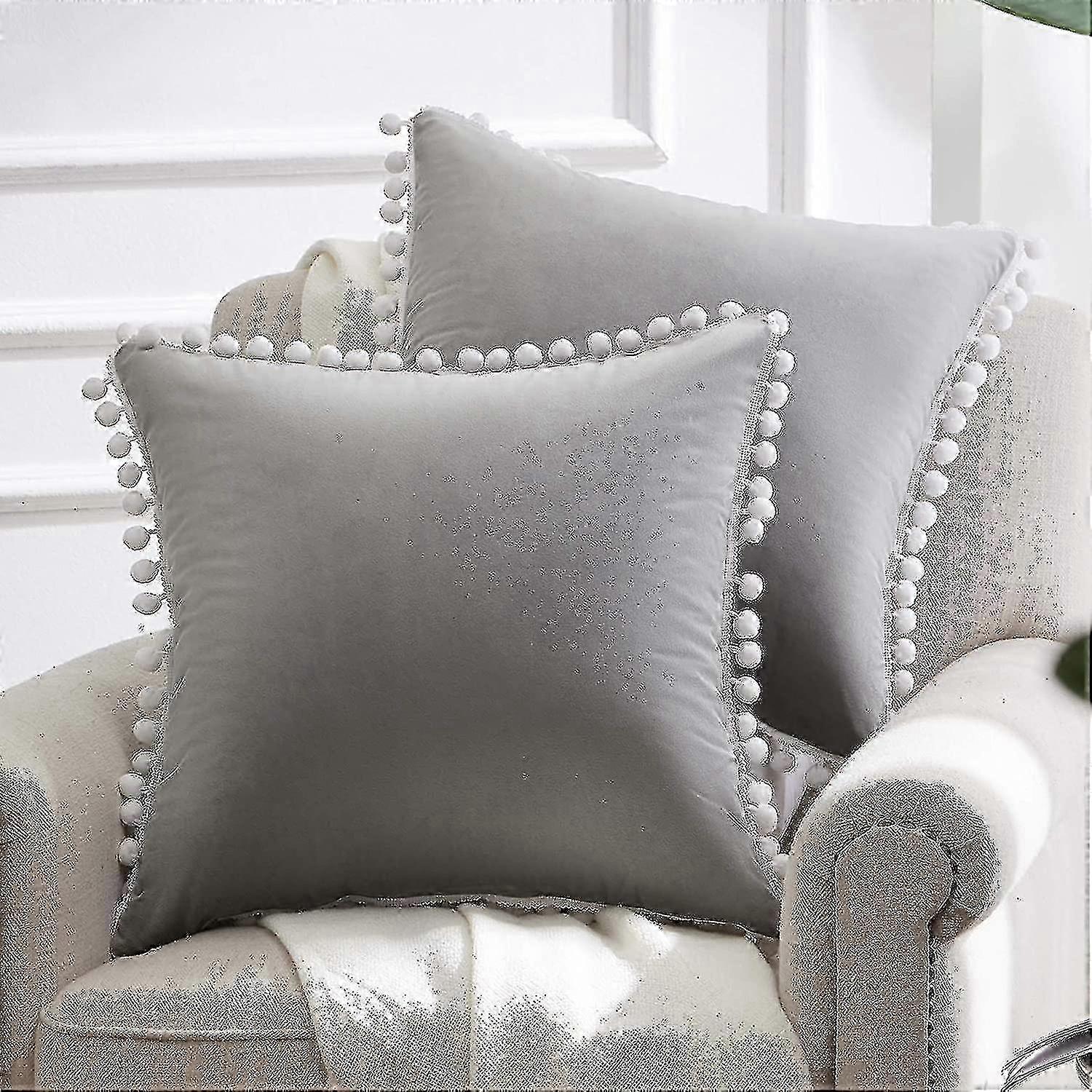 2 Pcs Decorative Pillow Cover With Pom Pom Soft Square Velvet Accent Cushion Cover Suitable for Home Decor 18 X 18 Inches