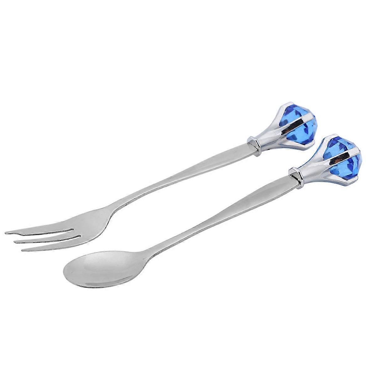 2Pcs/set Stainless Steel Fruit Dessert Spoon + Fork With Diamond Shape Decoration (Dark Blue)