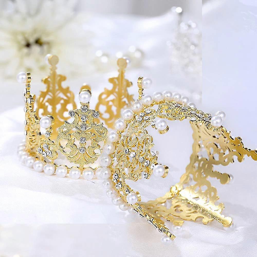 2 Pcs Small Gold Crown Decoration, Rhinestone Cake Topper For Wedding, Vintage King/princess Pearl Crown For Birthday