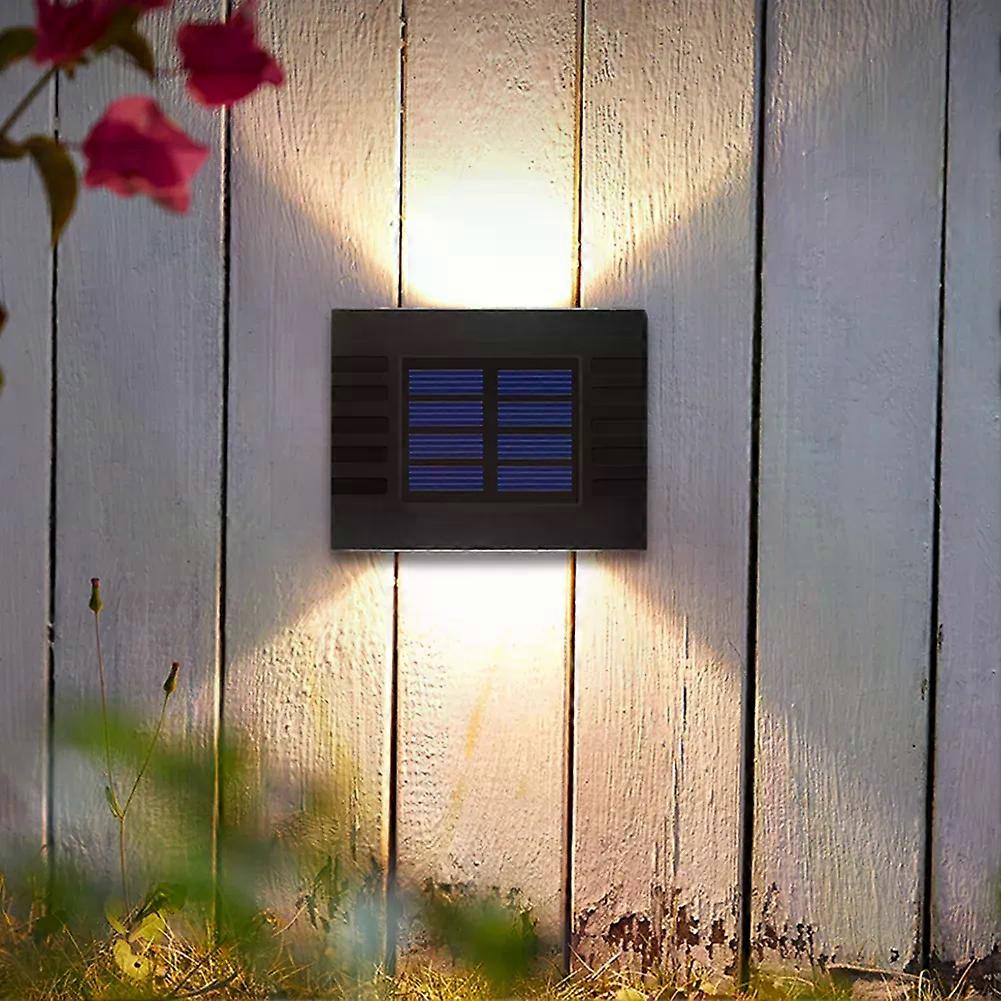 2 pcs. LED IP65 Outdoor Waterproof Solar Wall Lamp Garden Lights Indoor Bedroom Night Decoration Lighting Square LampsFeature:PC Lampshade: The specially designed super transparent lampshade can emit light better, making it appear brighter and more transparent. Superbrightness makes the night scene more beautiful; Polycrystalline Silicon Solar Energy: The panel adopts polycrystalline silicon solar panel, which can quickly absorb the energy and turn on the lights for about 8 hours; Energy saving: Solar garden lights do not require electricity. By integrating a powerful solar battery, the built-in lamp is taken by the sun during the day and turns on automatically in the dark. At the same time, it is economical and environmentally friendly. ABS plastic material: attention to detail of fine craftsmanship achieves the elegant charm of striking classics; IP65 Waterproof: The solar floor lamp is IP65 waterproof, so there is no need to worry about heavy rain, snow, frost or sleet. It can effectively insulate water mist. It is the best choice for driveway, deck, garden, etc. Small and exquisite, no complicated colors, no extra decorations. Specification: Product Name: Solar Double Side Single Side Wall WasherProduct Material: ABS Plastic Light Color: White Light; Warm, bright; Solar Panel: 1800/2400mAhBattery Model: 1200mAh Ni-MH BatteryApplication: 2 PacksSize: 10*7.5*3cm/3.94*2.95*1.18" Lamp Beads: 6LEDcharging Time: 6-8 hours in direct sunlightLighting Time: more than 8 hours for full powerApplicable Scene: Courtyard/Villa/Garden LightLight Body Color: White Light/Yellow Light Use Environment: Sunny PlaceWorking Voltage: 1.2V Product Net Weight: 90g The following environments are not suitable for installation:1. Glass room (although there is sunlight, the glass is blocked, which affects the brightness of the light and affects the battery charging);2. Monitoring area (the monitoring area is not installed directly, and the monitoring has infrared rays, which will affect the brightness of the light);3. Under tile eaves (no shingles, trees, wires or other obstructions over the area where the lamps are installed;4. Short exposure time (the area where the solar lamp is installed must be exposed to sunlight for at least 8 hours); Note:Due to the different monitor and light effect, the actual color of the item may be slightly different from the color showed on the pictures. Please allow 1-2cm measurement deviation due to manual measurement.2 X Solar Lamps2 X Installation Packages
