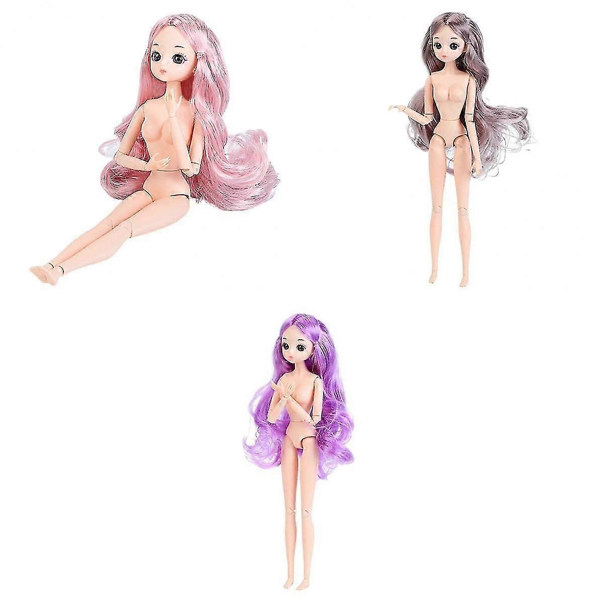 Pack of 2-3 1:6 Scale Flexible BJD 26 Jointed Girl Doll Nude Body with Hair 3pcs style 2