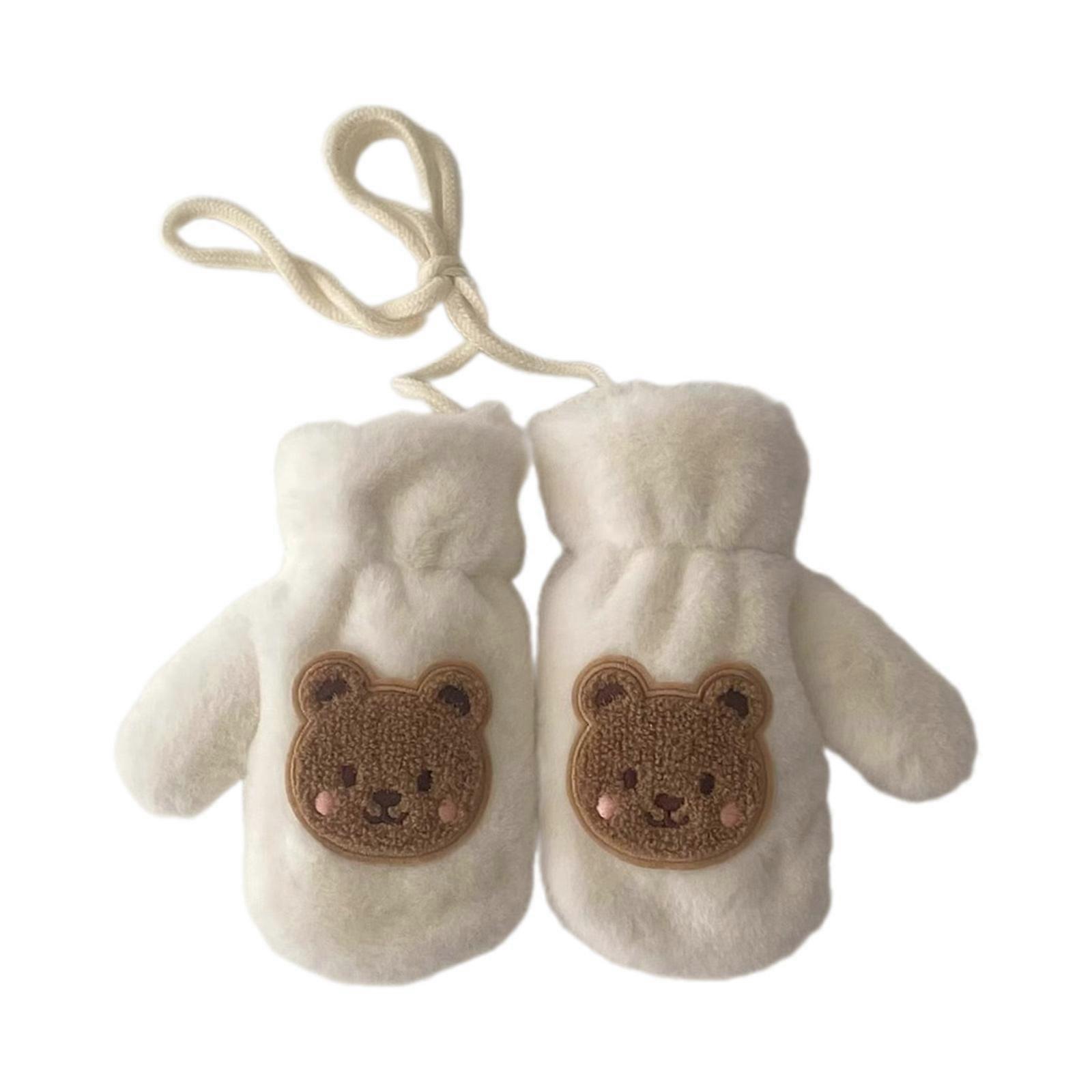 Cartoon Bear Plush Gloves for 2-6T Kids Children Winter Warm Mittens Stylish Hand Warmers with Adjsutable Neck Rope White